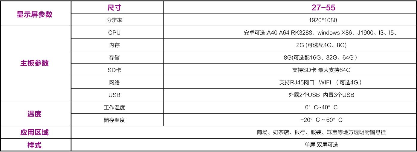超薄機身;超窄邊框;外觀精美;雙面設計;任意分屏顯示;多窗口視頻圖片播放;高清畫質;散熱快、流暢運行;是商業(yè)宣傳的不二之選。